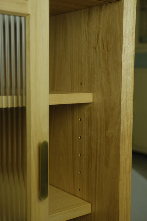 details: this is my most intricate piece to date. Everything about this sideboard just works, the tones from the chestnut with the brass accents that marry so well into the fluted glass sliding doors that let you see just enough of what's on the adjustable shelves on the inside.